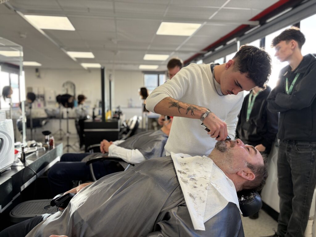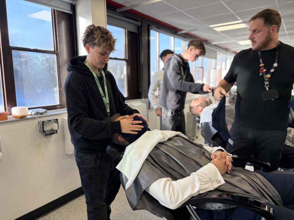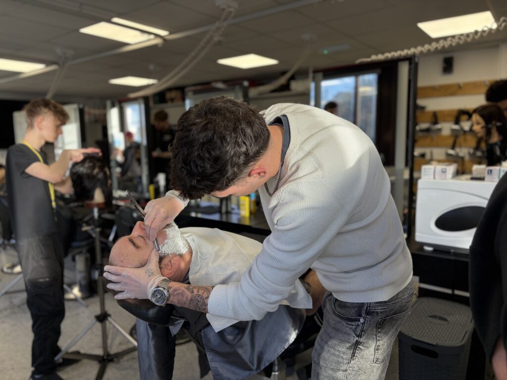 Although the final shave itself had to be carried out by tutors for safety reasons, the students played a central role every step of the way. Learners took responsibility for preparing the clients, applying hot towels, prepping the skin, creating the perfect lather, and setting up the workstation for their tutors.